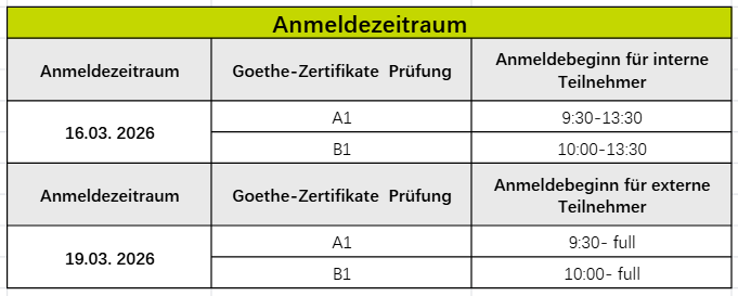 Als „interne Teilnehmer“ gelten Personen, die innerhalb von 6 Monaten vor dem Prüfungstermin einen Kurs am Guangcai Goethe-Sprachlernzentrum besucht haben. Sie haben das Recht, sich einmalig innerhalb des angegebenen Anmeldezeitraums zur Prüfung anzumelden und profitieren von der internen Prüfungsgebühr.