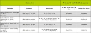 Eine Anmeldegebühr in Höhe von 100 RMB ist bereits im Gesamtpreis enthalten. Lehrbücher und Kursunterlagen sind inklusive – zur Abholung am ersten Kurstag (Präsenzkurse) oder als Lieferung nach Hause (Onlinekurs).
