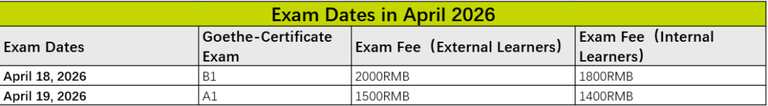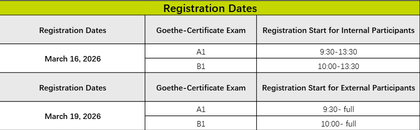 “Internal candidates” means “a student who has attended a course at Guangcai Goethe Language Centre within 6 months of the test date” and has the right to register for the test once and only once within the specified registration time, and is entitled to the internal test fee.