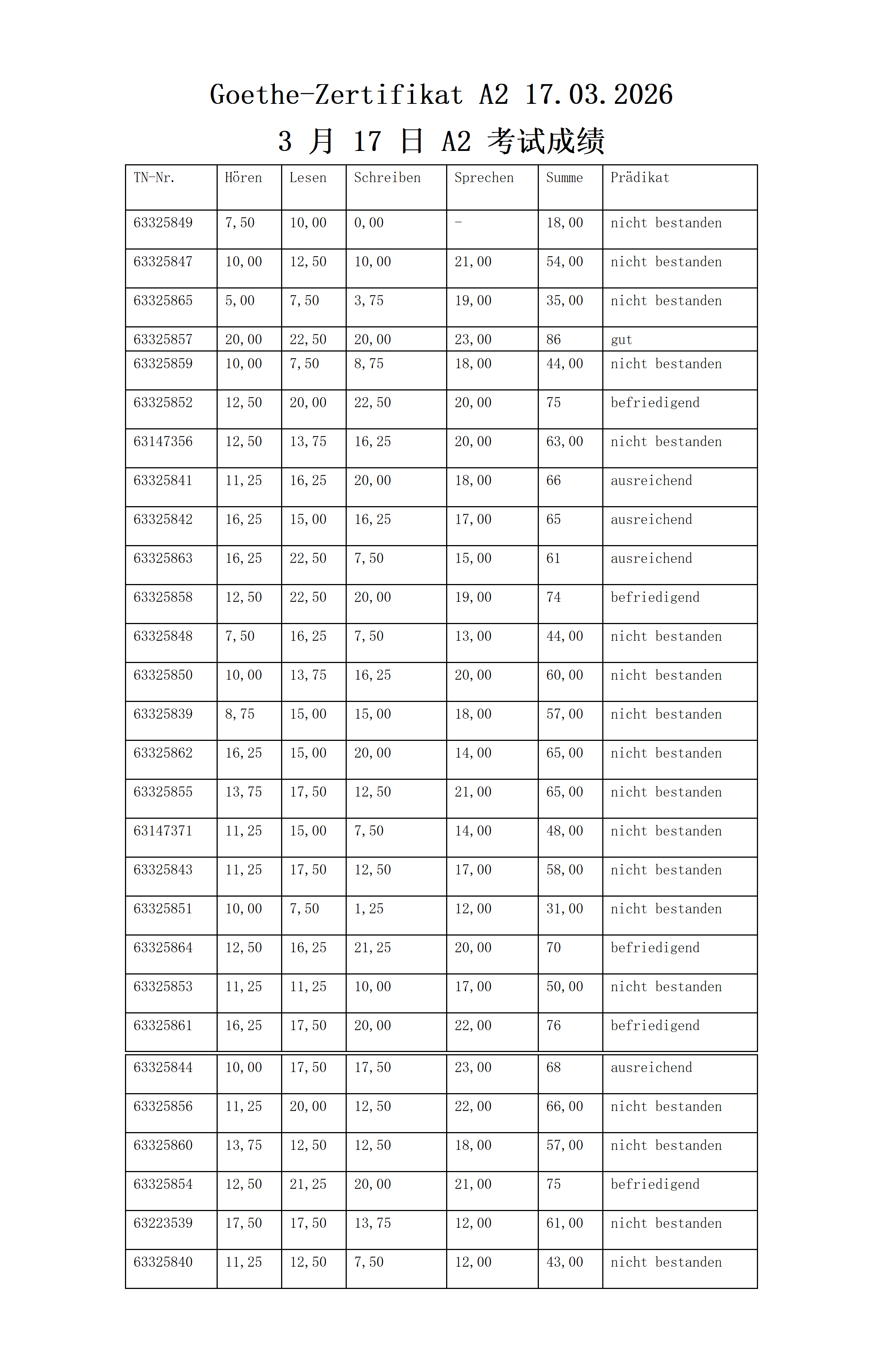 Results of Goethe-Zertifikat Exam A2 on 17, March 2026