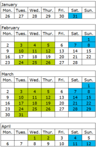 January 31, 2026 – April 12, 2026 (No Course: from February 13 to February 23, on February 28 and April 5)