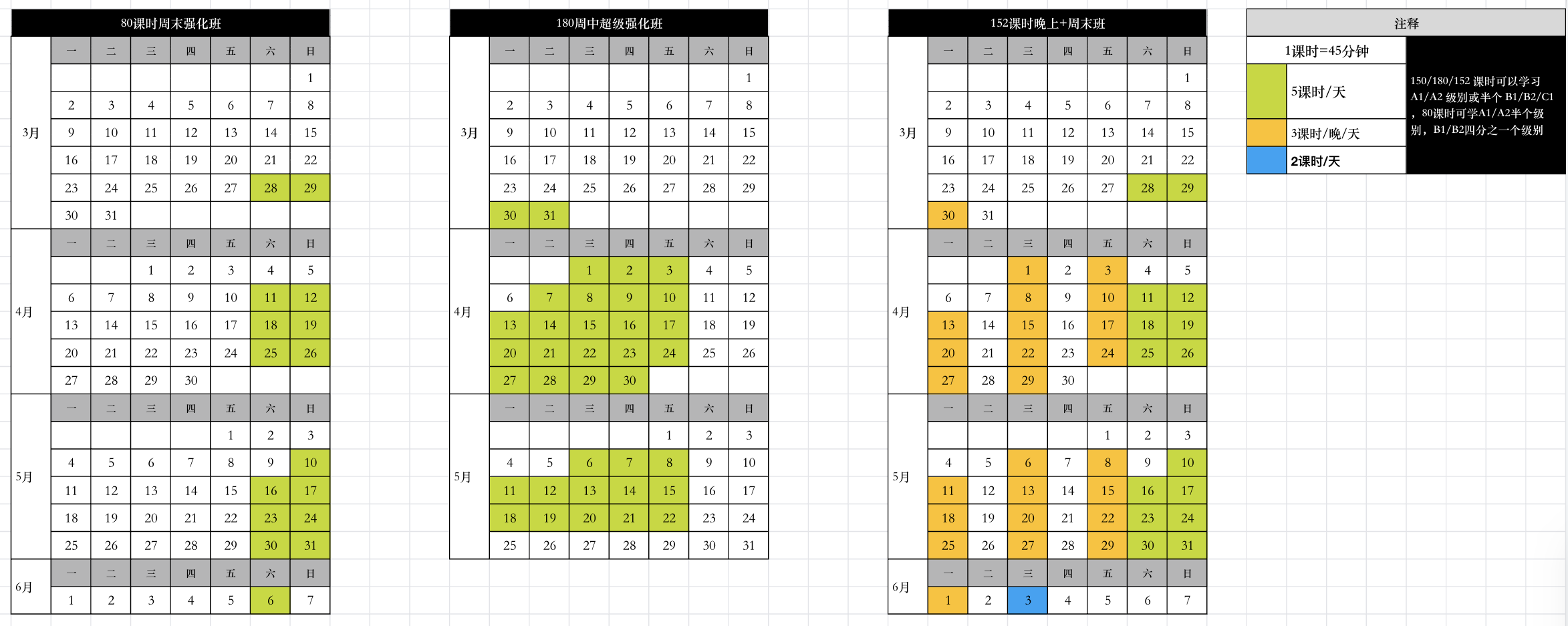180课时或152课时可学习A1/A2一个级别,B1/B2/C1半个级别;
