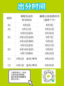 A1 考试通常在考后第一个工作日下午公布成绩;A2 成绩在考试后的大约 5 个工作日内公布;B1、B2、C1 级别考试成绩在 考试后的 大约 15 个工作日公布;C2 成绩在考试后的大约 20 个工作日公布;考生可以通过考号在我们的微信小程序上进行查询,成绩均为匿名。